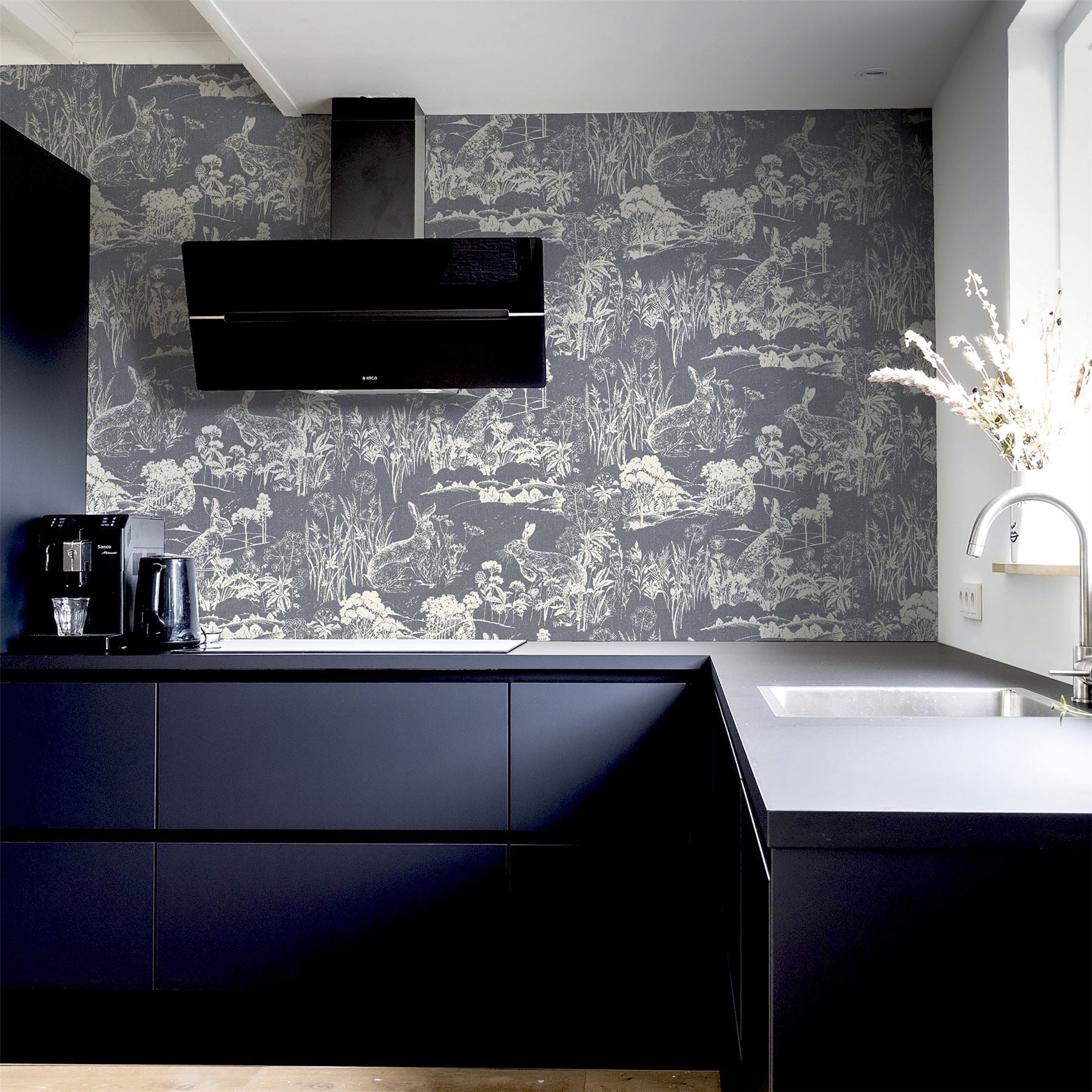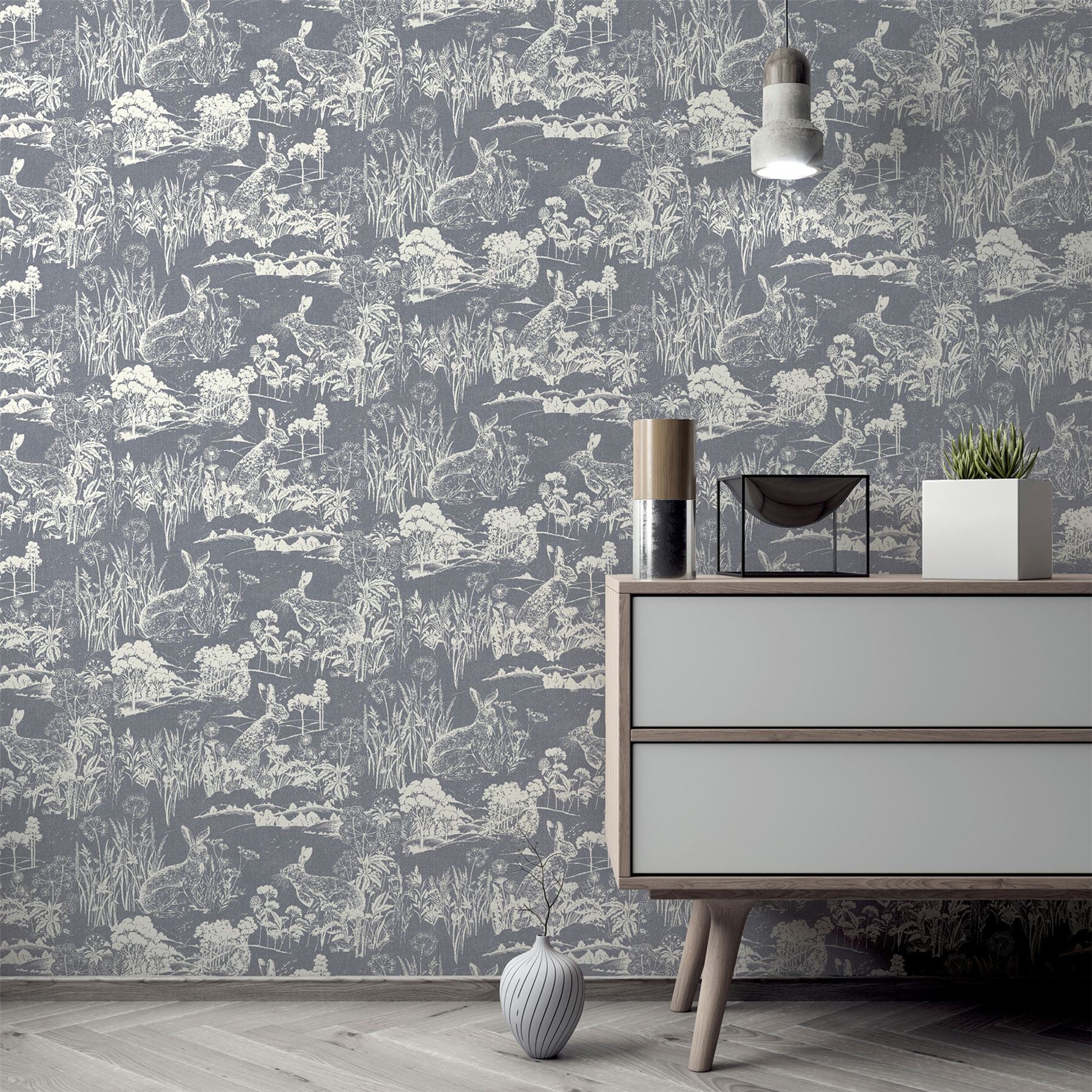 A country design, showing hare and flora and fauna of the countryside. A gorgeous countryside design is set on a navy background with the design in cream. This wallpaper is high quality and easy to apply, it would look great as a feature wall or throughout a whole room.