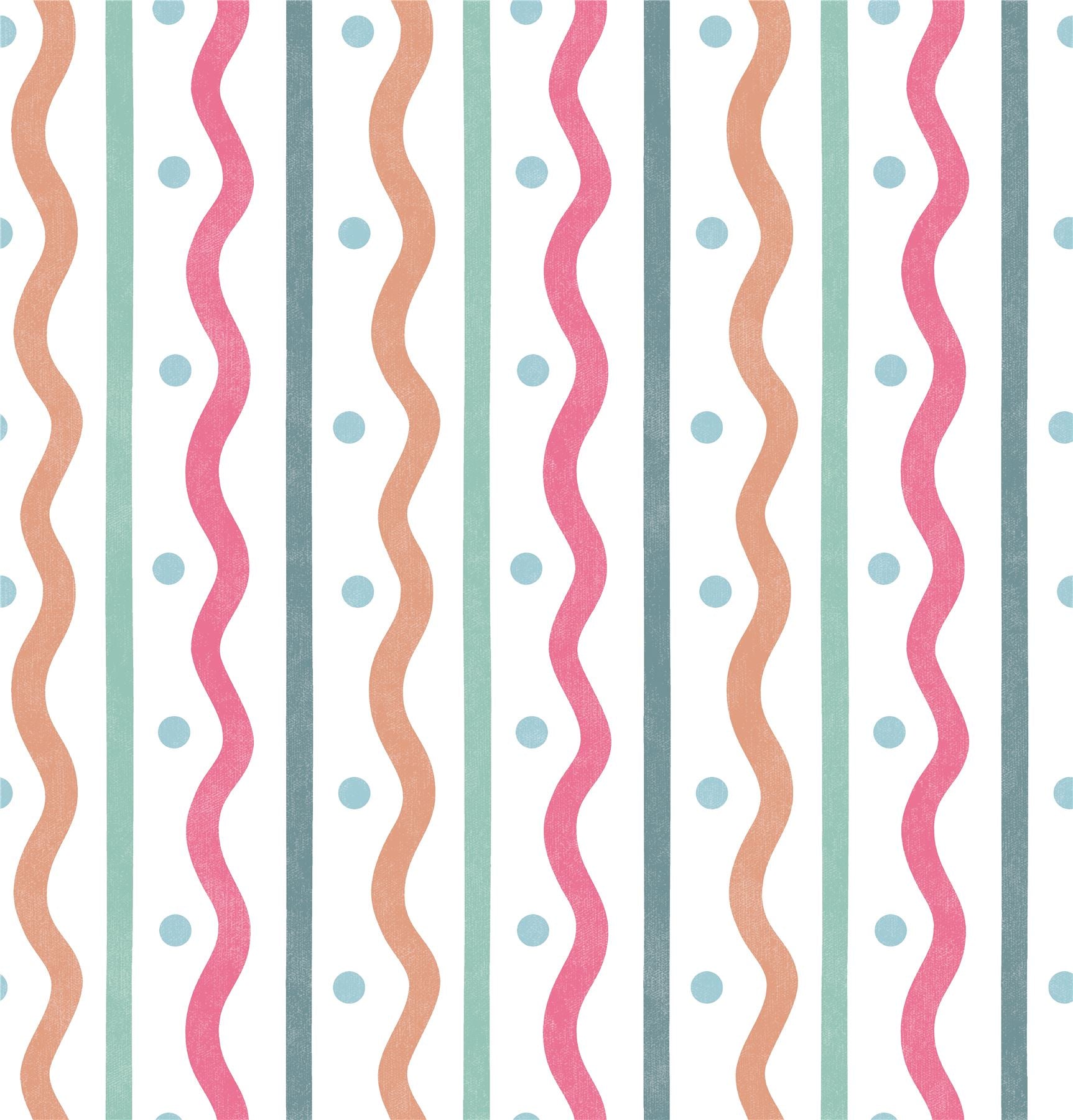 Add a playful and contemporary touch to your space with the "Squiggle Stripes Blue Green" wallpaper. This design features a fun pattern of wavy stripes in refreshing shades of blue and green, accented with subtle dots. The whimsical design brings a light-hearted and modern feel to any room. Designed for ease of use, this wallpaper is washable, strippable, and paste-the-wall.