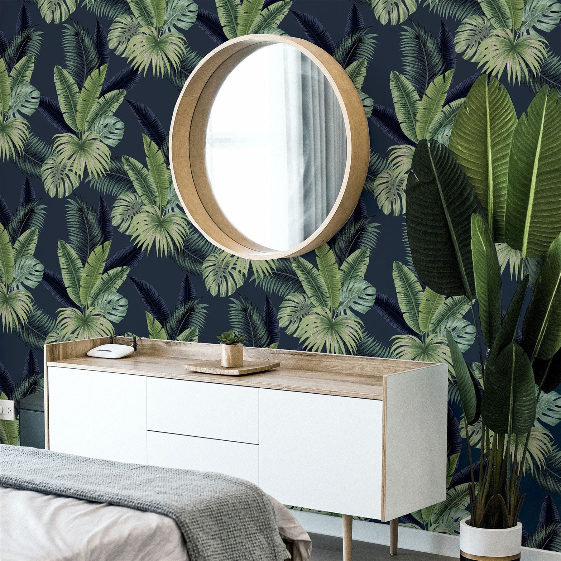 This stunningly vibrant wallpaper features tropical detailed leaves in an array of greens, against a rich navy background. The exotic design is sure to bring a lively feel to your room. Easy to apply, this wallpaper will look great when used to decorate a whole room or used to create a feature wall and is suitable for most rooms except high moisture environments.